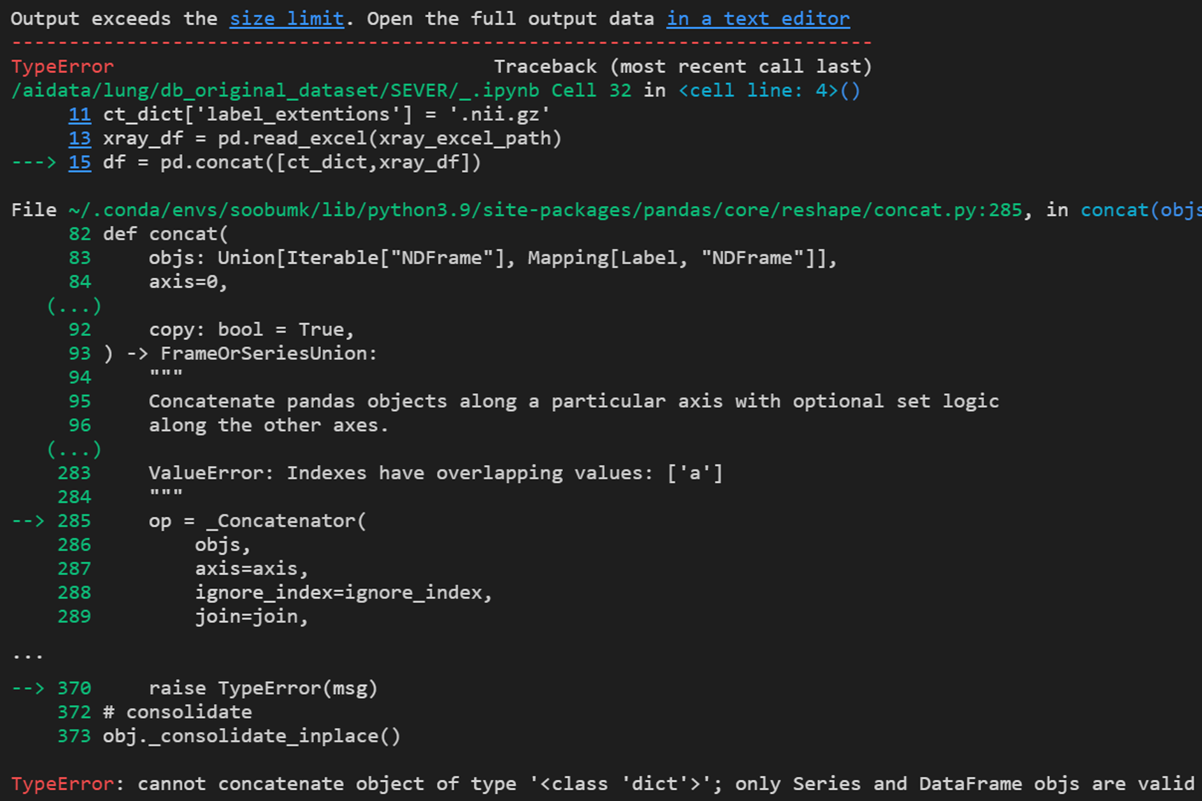 오류가 발생했던 코드이며, 가장 밑에 "df = pd.concat([ct_dict,xray_df])" 라인에서 오류가 나왔다.