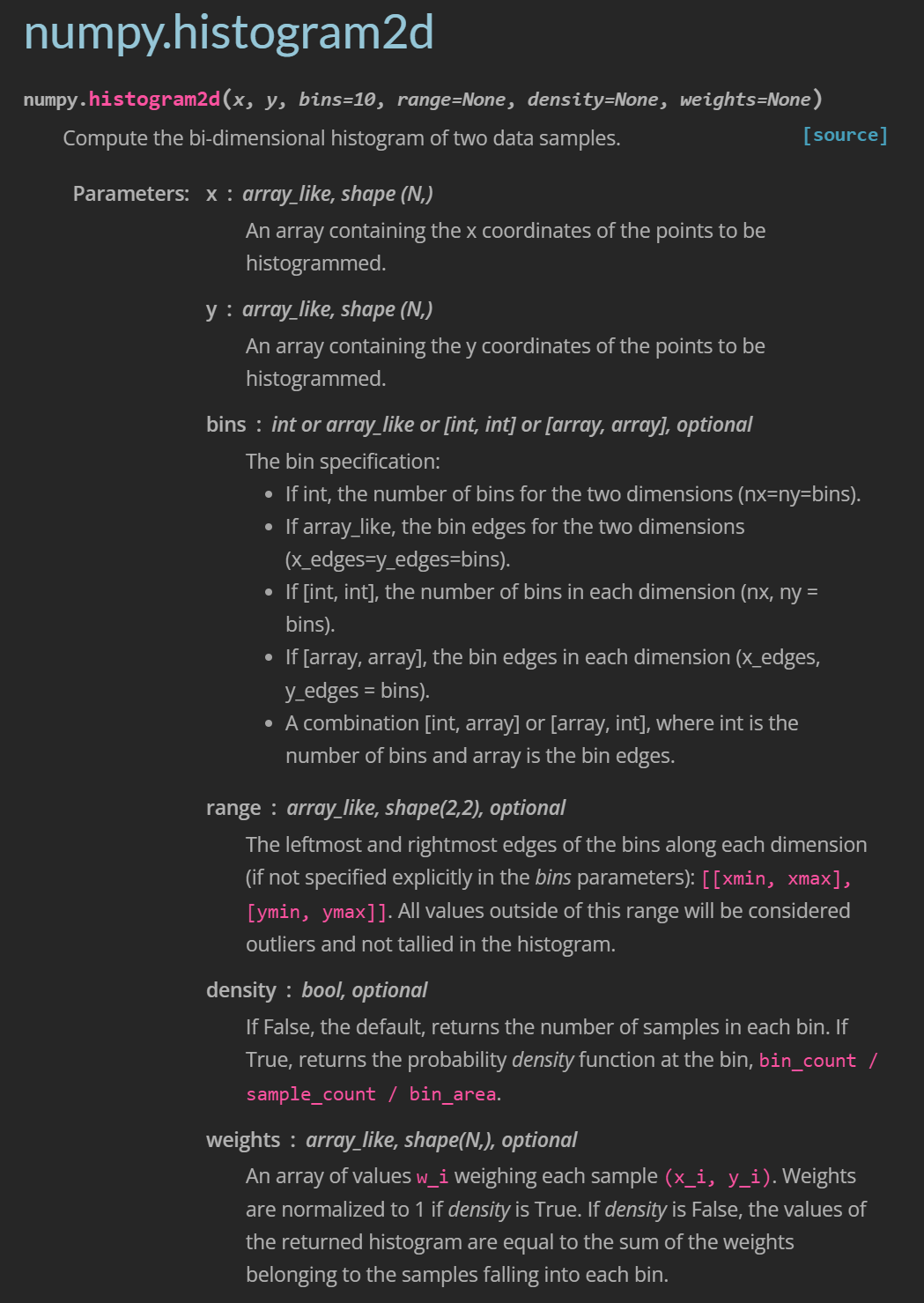 np.histogram2d에 대한 설명이다. 인자는 x, y, bins를 보통 받아서 사용이 되는데, 이 x와 y가 문제였다.